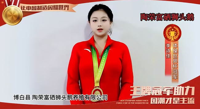 近日,由体操世界杯冠军李诗佳作视频品牌推广的博白县陶荣富硒狮头鹅养殖有限公司入选《传承工匠精神·彰显国潮魅力》专案品牌,进一步凸显了陶荣富硒狮头鹅行业龙头地位,为公司产品品牌迈向规模化、产业化发展筑牢根基。